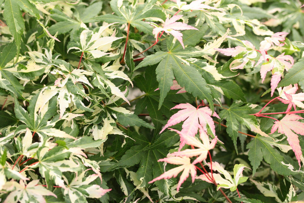 is a medium-sized Japanese maple with intense variegation splashed in pink, white, and green. More consistent coloring than the classic 'Oridono Nishiki', with occasional pink striations on the bark. Best planted in part shade or protected from hot afternoon sun to preserve vibrant variegation. An exceptional choice for collectors seeking dramatic, multi-colored foliage with reliable performance.